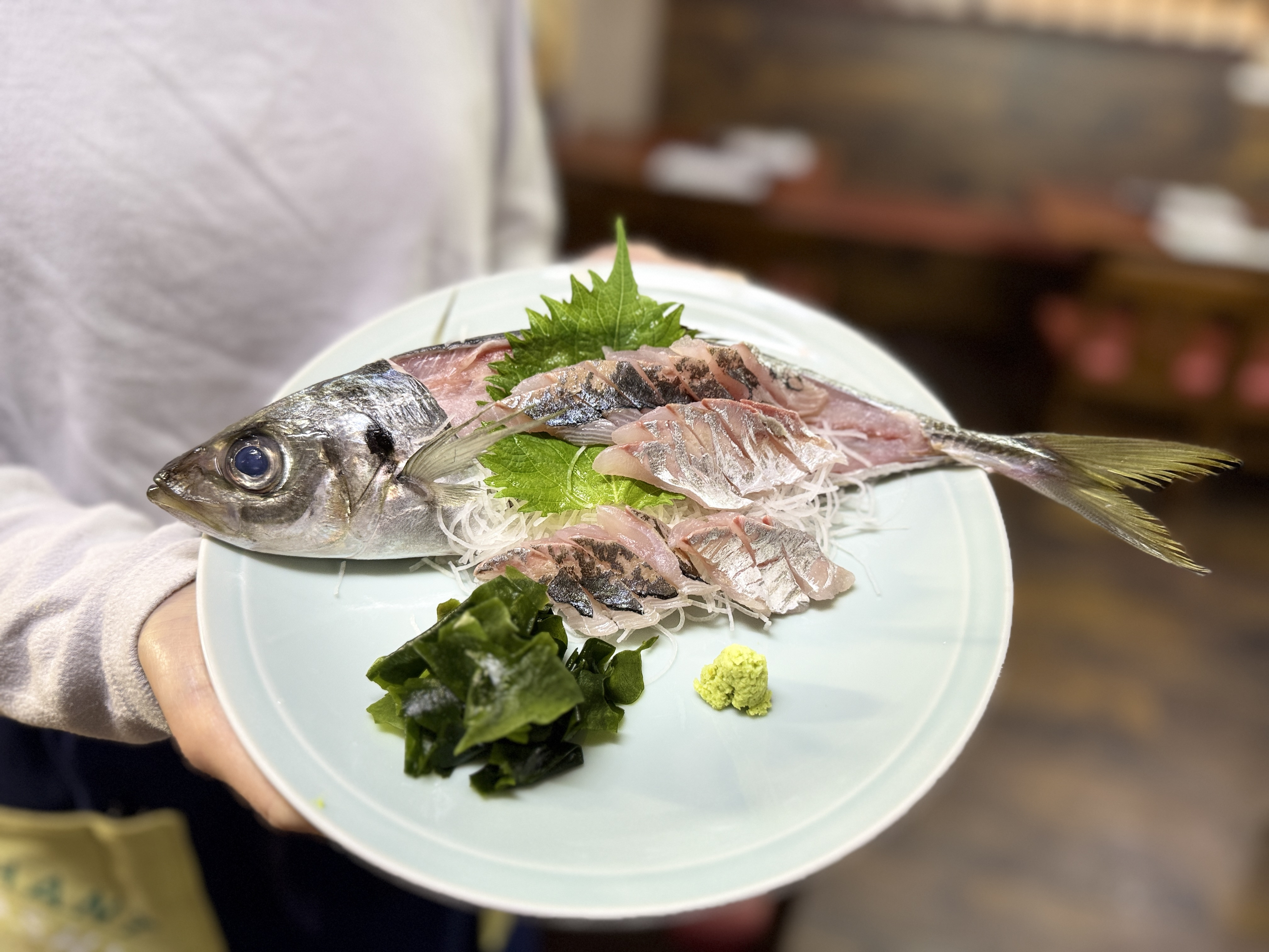 大間のマグロの他にも本日は大アジの姿造りがおすすめです。この大きさで2,000円!
